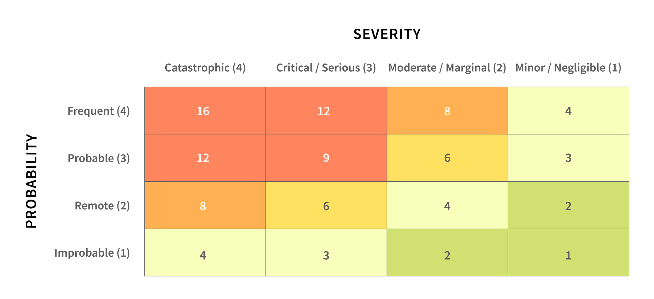 To illustrate, let's perform a hypothetical risk assessment on a table saw with an unguarded saw blade. The unguarded blade is identified as the hazard, with the severity of potential injury being finger amputation (i.e., Catastrophic [4]). The probability of contacting the blade is high due to its unguarded nature and frequent use (i.e., Probable [3]). Calculating the risk as 4 x 3 = 12 places it in the red portion of the risk matrix, indicating an unacceptable level of risk.